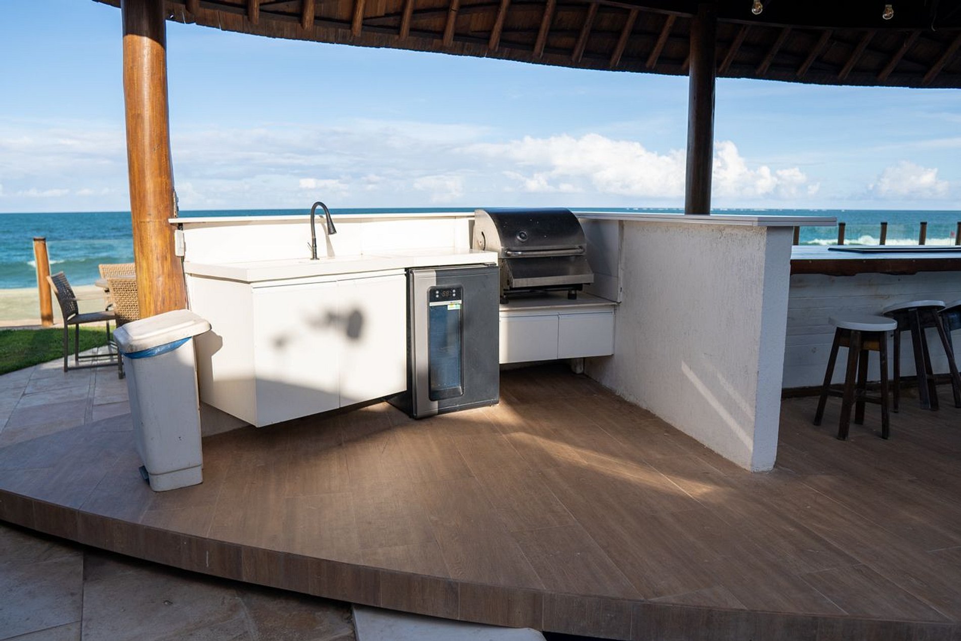 - Começando pelo deck que além de ter um design curioso também foi feito pensado no beneficio ,visto que ao centro possui um vão que possibilita que você possa por suas cervejas para gelar, facilitando o acesso e deixando o ambiente ainda mais instagramavel. Também possui um grande cooler ao lado da churrasqueira.